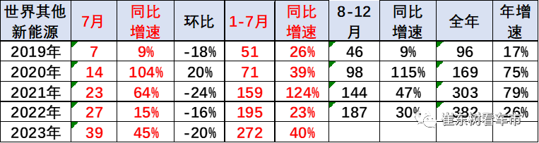 2021-2022年呈现加速上升态势,低基数下的增长更强。2023年世界新能源车起步较低,7月基本恢复强势高增长。