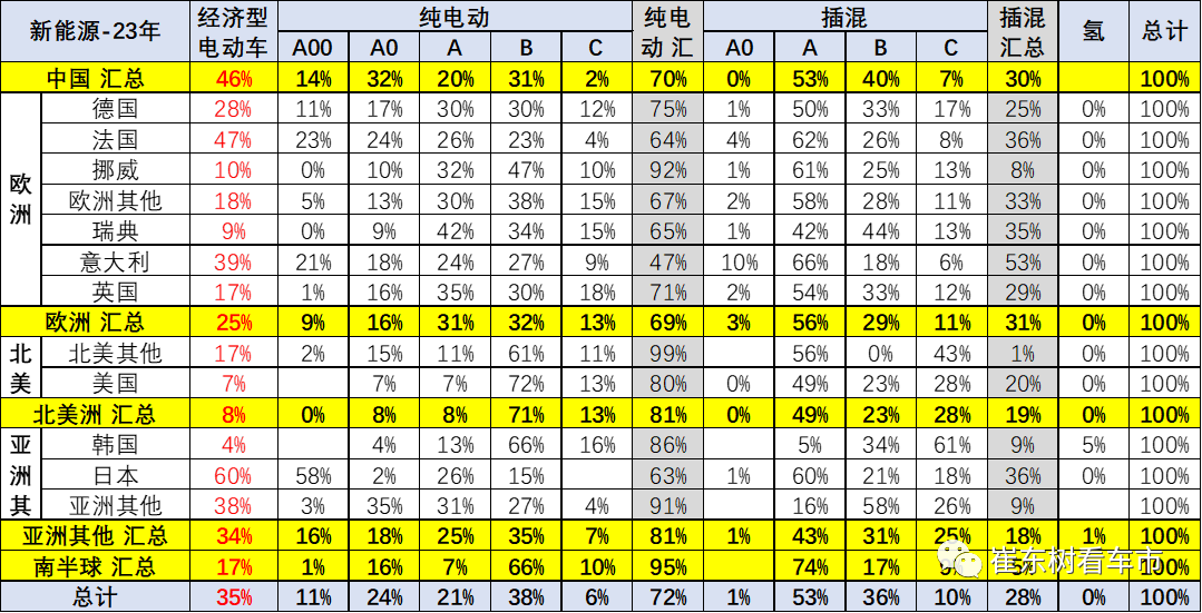世界B级电动车的占比较高,而A级的占比偏低,这也是特斯拉的世界布局的特色效果。